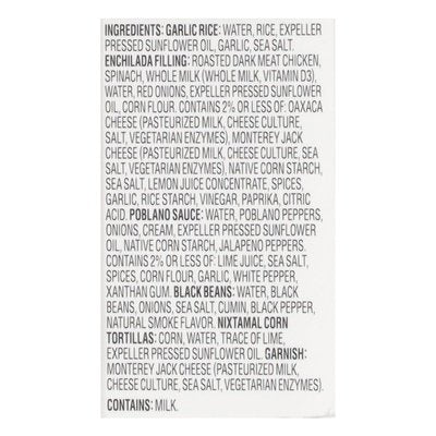 INGREDIENTS: Garlic Rice: Water, Rice, Expeller Pressed Sunflower Oil, Garlic, Sea Salt, Enchilada Filling: Roasted Dark Meat Chicken, Spinach, Whole Milk (Whole Milk, Vitamin D3), Water, Red Onions, Expeller Pressed Sunflower Oil, Corn Flour, Contains 2% or Less of: Oaxaca Cheese (Pasteurized Milk, Cheese Culture, Salt, Vegetarian Enzymes), Monterey Jack Cheese (Pasteurized Milk, Cheese Culture, Sea Salt, Vegetarian Enzymes), Native Corn Starch, Sea Salt, Lemon Juice Concentrate, Spices, Garlic, Rice Starch, Vinegar, Paprika, Citric Acid, Poblano Sauce: Water, Poblano Peppers, Onions, Cream, Expeller Pressed Sunflower Oil, Native Corn Starch, Jalapeno Peppers, Contains 2% or Less of Lime Juice, Sea Salt, Spices, Corn Flour, Garlic, White Pepper, Xanthan Gum, Black Beans: Water, Black Beans, Onions, Sea Salt, Cumin, Black Pepper, Natural Smoke Flavor, Nixtamal Corn Tortillas: Corn, Water, Trace of Lime, Expeller Pressed Sunflower Oil, Garnish: Monterey Jack Cheese (Pasteurized Milk, Cheese Culture, Sea Salt, Vegetarian Enzymes).
