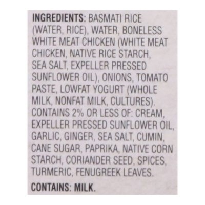 INGREDIENTS: Basmati Rice (Water, Rice), Water, Boneless White Meat Chicken (White Meat Chicken, Native Rice Starch, Sea Salt, Expeller Pressed Sunflower Oil), Onions, Tomato Paste, Lowfat Yogurt (Whole Milk, Nonfat Milk, Cultures), Contains 2% or Less of: Cream, Expeller Pressed Sunflower Oil, Garlic, Ginger, Sea Salt, Cumin, Cane Sugar, Paprika, Native Corn Starch, Coriander Seed, Spices, Turmeric, Fenugreek Leaves.