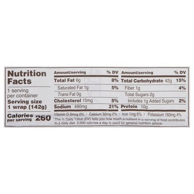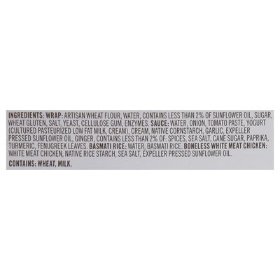 INGREDIENTS: Wrap: Artisan Wheat Flour, Water, Contains Less than 2% of Sunflower Oil, Sugar, Wheat Gluten, Salt, Yeast, Cellulose Gum, Enzymes, Sauce: Water, Onion, Tomato Paste, Yogurt (Cultured Pasteurized Low Fat Milk, Cream), Cream, Native Cornstarch, Garlic, Expeller Pressed Sunflower Oil, Ginger, Contains Less than 2% of: Spices, Sea Salt, Cane Sugar, Paprika, Turmeric, Fenugreek leaves. Basmati Rice: Water, Basmati Rice. Boneless White Meat Chicken: White Meat Chicken, Native Rice Starch, Sea Salt, Expeller Pressed Sunflower Oil.