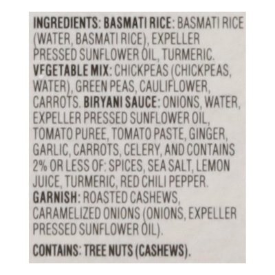 INGREDIENTS: Basmati Rice: Basmati Rice (Water, Basmati Rice), Expeller Pressed Sunflower Oil, Turmeric, Vegetable Mix: Chickpeas (Chickpeas, Water), Green Peas, Cauliflower, Carrots, Biryani Sauce: Onions, Water, Expeller Pressed Sunflower Oil, Tomato Puree, Tomato Paste, Ginger, Garlic, Carrots, Celery, and Contains 2% or Less of Spices, Sea Salt, Lemon Juice, Turmeric, Red Chili Pepper, Garnish: Roasted Cashews, Caramelized Onions (Onions, Expeller Pressed Sunflower Oil).