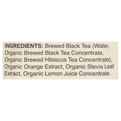 INGREDIENTS: Brewed Black Tea (Water, Organic Brewed Black Tea Concentrate, Organic Brewed Hibiscus Tea Concentrate), Organic Orange Extract, Organic Stevia Leaf Extract, Organic Lemon Juice Concentrate.