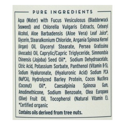 INGREDIENTS: Pure Ingredients: Aqua (Water) with Fucus Vesiculosus (Bladderwrack Seaweed) and Chlorella Vulgaris Extracts, Cetearyl Alcohol, Aloe Barbadensis (Aloe Vera) Leaf Juice (Certified Organic), Glycerin, Stearalkonium Chloride, Argania Spinosa Kernel (Ann) Oil, Glyceryl Stearate, Persea Gratissima (Avocado) Oil Caprylic/Capric Triglyceride, Simmondsia Chinensis (Jojoba) Seed Oil (Certified Organic), Sodium Dehydroacetate, Citric Acid, Potassium Sorbate, Panthenol (Vitamin B-5), Sodium Hyaluronate, (Hyaluronic Acid) Sodium PCA (Napca), Hydrolyzed Barley Protein, Cocos Nucifera (Coconut) Oil (Certified Organic), Caesalpinia Spinosa Gum, Amodimethicone, Sodium Benzoate, Olea Europaea (Olive) Fruit Oil, Tocopherol (Natural Vitamin E).
