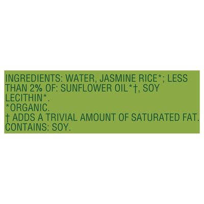 INGREDIENTS: Water, Jasmine Rice (Organic), Less than 2% of: Sunflower Oil (Organic) (Adds a Trivial Amount of Saturated Fat), Soy Lecithin (Organic).