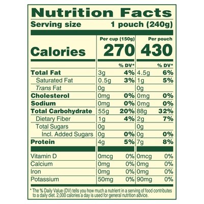 PRODUCT DETAILS: Per 1 Cup: 270 calories; 0.5 g sat fat (3% DV); 0 mg sodium (0% DV); 0 g total sugars. USDA Organic. Certified Organic: Quality Assurance International. Certified organic by QAI. Rice is a sodium free food. Not a low calorie food. No artificial ingredients or preservatives. Vegetarian. Non-GMO Project verified. nongmoproject.org. Microwave in the pouch: 90 seconds. www.seedsofchange.com. Instagram. Show us how you're making a change (at)seedsofchange. Let's keep it real. Real food with real ingredients made easy. Let's get everyone eating what's good for their bodies and for the earth - one organic tasty meal at a time. 1% of profits go to helping others enjoy real food. See our changes for good at www.seedsofchange.com. BPA free pouch.