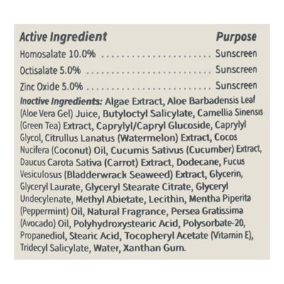INGREDIENTS: Active Ingredients: Homosalate (10.0 %), Sunscreen; Zinc Oxide (5.0 %), Sunscreen.; Zinc Oxide (5.0 %), Sunscreen. Inactive Ingredients: Algae Extract, Aloe Barbadensis Leaf (Aloe Vera Gel) Juice, Butyloctyl Salicylate, Camellia Sinensis (Green Tea) Extract, Caprylyl/Capryl Glucoside, Caprylyl Glycol, Citrullus Lanatus (Watermelon) Extract, Cocos Nucifera (Coconut) Oil, Cucumis Sativus (Cucumber) Extract, Daucus Carota Sativa (Carrot) Extract, Dodecane, Fucus Vesiculosus (Bladderwrack Seaweed) Extract, Glycerin, Glyceryl Laurate, Glyceryl Stearate Citrate, Glyceryl Undecylenate, Methyl Abietate, Lecithin, Metha Piperita (Peppermint) Oil, Natural Fragrance, Persea Gratissima (Avocado) Oil, Polyhydroxystearic Acid, Polysorbate-20, Propanediol, Stearic Acid, Tocopheryl Acetate (Vitamin E), Tridecyl Salicylate, Water, Xanthan Gum.