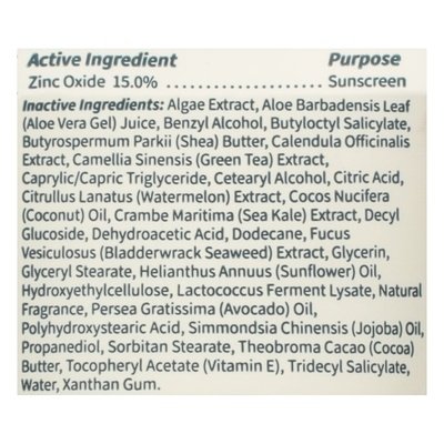 INGREDIENTS: Active Ingredients: Zinc Oxide (15.0 %), Sunscreen. Inactive Ingredients: Algae Extract, Aloe Barbadensis Leaf (Aloe Vera Gel) Juice, Benzyl Alcohol, Butyloctyl Salicylate, Butyrospermum Parkii (Shea) Butter, Calendula Officinalis Extract, Camellia Sinensis (Green Tea) Extract, Caprylic/Capric Triglyceride, Cetearyl Alcohol, Citric Acid, Citrullus Lanatus (Watermelon) Fruit Extract, Cocos Nucifera (Coconut) Oil, Crambe Maritima (Sea Kale) Extract, Decyl Glucoside, Dehydroacetic Acid, Dodecane, Fucus Vesiculosus (Bladderwrack Seaweed) Extract, Glycerin, Glyceryl Stearate, Helianthus Annuus (Sunflower) Oil, Hydroxyethylcellulose, Lactococcus Ferment Lysate, Natural Fragrance, Persea Gratissima (Avocado) Oil, Polyhydroxystearic Acid, Simmondsia Chinensis (Jojoba) Oil, Propanediol, Sorbitan Stearate, Theobroma Cacao (Cocoa) Butter, Tocopheryl Acetate (Vitamin E), Tridecyl Salicylate, Water, Xanthan Gum.