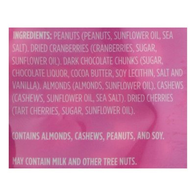 INGREDIENTS: Peanuts (Peanuts, Sunflower Oil, Sea Salt), Dried Cranberries (Cranberries, Sugar, Sunflower Oil), Dark Chocolate Chunks (Sugar, Chocolate Liquor, Cocoa Butter, Soy Lecithin, Salt and Vanilla), Almonds (Almonds, Sunflower Oil), Cashews (Cashews, Sunflower Oil, Sea Salt), Dried Cherries (Tart Cherries, Sugar, Sunflower Oil).