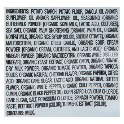 INGREDIENTS: Potato Starch, Potato Flour, Canola Oil and/or Sunflower Oil and/or Safflower Oil, Seasoning (Organic Buttermilk Powder [Organic Skim Milk, Lactic Acid, Cultures], Sea Salt Organic Palm Shortening [Organic Palm Oil, Organic Nonfat Milk, Organic Rice Syrup Solids, Sodium Citrate], Organic Maltodextrin, Organic Dried Garlic, Organic Sour Cream Powder [Organic Cream, Cultures, and Lactic Acid], Organic Vinegar Powder [Organic Maltodextrin, Organic White Distilled Vinegar], Organic Yeast Extract, Organic Onion, Organic Nonfat Dry Milk Powder, Organic Tomato Powder, Organic Tapioca Solids, Organic Natural Cheddar Flavor, Organic Paprika, Citric Acid, Organic Cane Sugar, Lactic Acid, Organic Natural Butter Flavor, Organic White Pepper, Organic Chili Pepper, Organic Cumin, Organic Black Pepper Oil), Corn Starch, Calcium Chloride, Cane Sugar, Salt, Potassium Chloride, Spinach Powder, Tomatopaste, Beetroot Powder (Color), Turmeric Extract (Color).