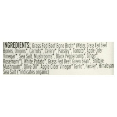 INGREDIENTS: Grass Fed Beef Bone Broth (Indicates Organic) (Water, Grass Fed Beef Bones, Onions (Indicates Organic), Carrots (Indicates Organic), Celery (Indicates Organic), Parsley (Indicates Organic), Tomato (Indicates Organic), Apple Cider Vinegar (Indicates Organic), Sea Salt (Indicates Organic), Mushrooms (Indicates Organic), Black Peppercorns (Indicates Organic), Ginger (Indicates Organic), Rosemary (Indicates Organic)), White Potato (Indicates Organic), Grass Fed Beef, Green Bean (Indicates Organic), Shiitake Mushroom (Indicates Organic), Olive Oil (Indicates Organic), Apple Cider Vinegar (Indicates Organic), Garlic (Indicates Organic), Parsley (Indicates Organic), Himalayan Sea Salt.