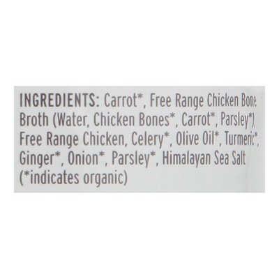 INGREDIENTS: Carrot (Indicates Organic), Free Range Chicken Bone Broth (Water, Chicken Bones (Indicates Organic), Carrot (Indicates Organic) Parsley (Indicates Organic), Free Range Chicken, Celery (Indicates Organic) Olive Oil (Indicates Organic), Turmeric (Indicates Organic), Ginger (Indicates Organic), Onion (Indicates Organic), Parsley (Indicates Organic), Himalayan Sea Salt (Indicates Organic).
