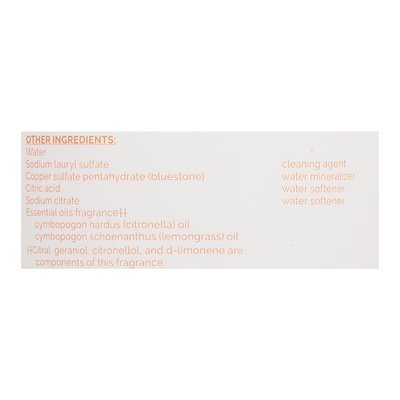INGREDIENTS: Active Ingredient: Thymol (0.05%), Other Ingredients (99.95%), Total (100.00%). Other Ingredients: Water, Sodium Lauryl Sulfate (Cleaning Agent), Copper Sulfate Pentahydrate (Bluestone) (Water Mineralizer), Citric Acid (Water Softener), Sodium Citrate (Water Softener), Essential Oils Fragrance (Citral, Geraniol, Citronellol, and D-Limonene Are Components of This Fragrance) Cymbopogon Nardus (Citronella) Oil, Cymbopogon Schoenanthus (Lemongrass) Oil. Wipe Material: Blend of Rayon and Polyester.