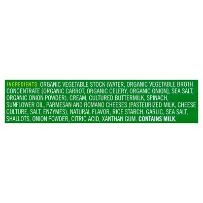 INGREDIENTS: Organic Vegetable Stock (Water, Organic Vegetable Broth Concentrate [Organic Carrot, Organic Celery, Organic Onion], Sea Salt, Organic Onion Powder), Cream, Cultured Buttermilk, Spinach, Sunflower Oil, Parmesan and Romano Cheeses (Pasteurized Milk, Cheese Culture, Salt, Enzymes), Natural Flavor, Rice Starch, Garlic, Sea Salt. Shallots, Onion Powder, Citric Acid, Xanthan Gum.