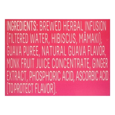 INGREDIENTS: Brewed Herbal Infusion (Filtered Water, Hibiscus, Mamaki), Guava Puree, Natural Guava Flavor, Monk Fruit Juice Concentrate, Ginger Extract, Phosphoric Acid, Ascorbic Acid to Protect Flavor].