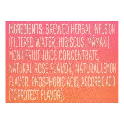 INGREDIENTS: Brewed Herbal Infusion (Filtered Water, Hibiscus, Mamaki), Monk Fruit Juice Concentrate Natural Rose Flavor, Natural Lemon Flavor, Phosphoric Acid, Ascorbic Acid to Protect Flavor.