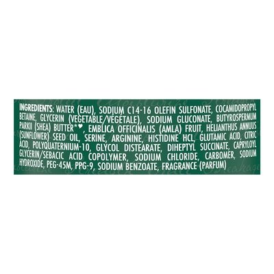 INGREDIENTS: Water (Eau), Sodium C14-16 Olefin Sulfonate, Cocamidopropyl Betaine, Glycerin (Vegetable/Vegetale), Sodium Gluconate, Butyrospermum Parkii (Shea) Butter (Certified Organic Ingredient)(Fair Trade Ingredient), Emblica Officinalis (Amla) Fruit, Helianthus Annuus (Sunflower) Seed Oil, 'Serine, Arginine, Histidine HCl, Glutamic Acid, Citric Acid, Polyquaternium-10, Glycol Distearate, Diheptyl Succinate, Capryloyl Glycerin/Sebacic Acid Copolymer, Sodium Chloride, Carbomer, Sodium Hydroxide, PEG-45M, PPG-9, Sodium Benzoate, Fragrance (Parfum).