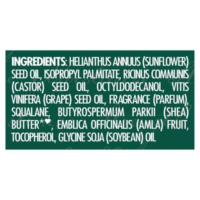 INGREDIENTS: Helianthus Annuus (Sunflower) Seed Oil, Isopropyl Palmitate, Ricinus Communis (Castor) Seed Oil, Octyldodecanol, Vitis Vinifera (Grape) Seed Oil, Fragrance (Parfum), Squalane, Butyrospermum Parkii (Shea) Butter (Certified Organic Ingredient) (Fair Trade Ingredient), Emblica Officinalis (Amla) Fruit, Tocopherol, Glycine Soja (Soybean) Oil.