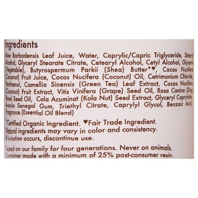 INGREDIENTS: Aloe Barbadensis Leaf Juice, Water, Caprylic/Capric Triglyceride, Stearyl Alcohol, Glyceryl Stearate Citrate, Cetearyl Alcohol, Cetyl Alcohol, Glycerin (Vegetable), Butyrospermum Parkii (Shea Butter [Certified Organic Ingredient, Fair Trade Ingredient], Cocos Nucifera (Coconut), Fruit Extract, Vitis Vinifera (Grape) Seed Oil, Rosa Canina (Dog Rose) Seed Oil, Cola Acuminat (Kola Nut) Seed Extract, Glyceryl Caprylate, Acacia Senegal Gum, Triethyl Citrate, Caprylyl Glycol, Benzoic Acid, Fragrance (Essential Oil Blend).