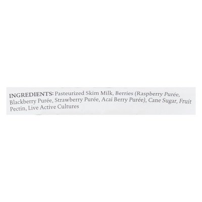 INGREDIENTS: Pasteurized Skim Milk, Berries (Raspberry Puree, Blackberry Puree, Strawberry Puree, Acai Berry Puree), Cane Sugar, Fruit Pectin, Live Active Cultures, Live Active Culture: S. Thermophilus, L. Bulgaricus, Bifidobacterium, L. Acidophilus, L, Paracasei.