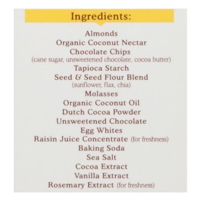 INGREDIENTS: Almonds Organic Coconut Nectar Chocolate Chips (Cane Sugar, Unsweetened Chocolate, Cocoa Butter) Tapioca Starch Seed & Seed Flour Blend (Sunflower, Flax, Chia) Molasses, Organic Coconut Oil Dutch Cocoa Powder Unsweetened Chocolate Egg Whites Raisin Juice Concentrate (for Freshness) Baking Soda Sea Salt Cocoa Extract Vanilla Extract Rosemary Extract (for Freshness).