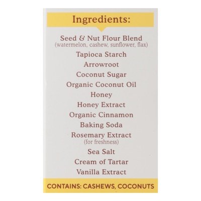 INGREDIENTS: Seed & Nut Flour Blend (Watermelon, Cashew, Sunflower, Flax), Tapioca Starch, Arrowroot, Coconut Sugar, Organic Coconut Oil, Honey, Honey Extract, Organic Cinnamon, Baking Soda, Rosemary Extract (for Freshness), Sea Salt, Cream of Tartar, Vanilla Extract.