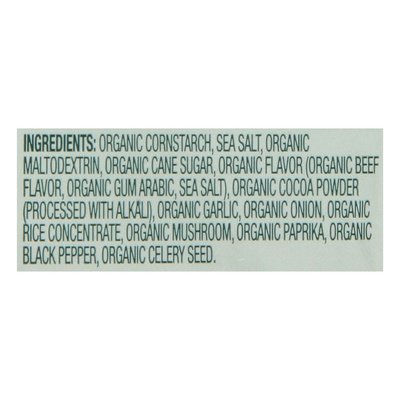 INGREDIENTS: Organic Cornstarch, Sea Salt, Organic Maltodextrin, Organic Cane Sugar, Organic Flavor (Organic Beef Flavor, Organic Gum Arabic, Sea Salt), Organic Cocoa Powder (Processed with Alkali), Organic Garlic, Organic Onion, Organic Rice Concentrate, Organic Mushroom, Organic Paprika, Organic Black Pepper, Organic Celery Seed.