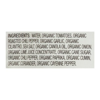 INGREDIENTS: Water, Organic Tomatoes, Organic Roasted Chili Pepper, Organic Garlic, Organic Cilantro, Sea Salt, Organic Canola Oil, Organic Onion, Organic Lime Juice Concentrate, Organic Cane Sugar, Organic Chili Pepper, Organic Paprika, Organic Cumin, Organic Coriander, Organic Cayenne Pepper.