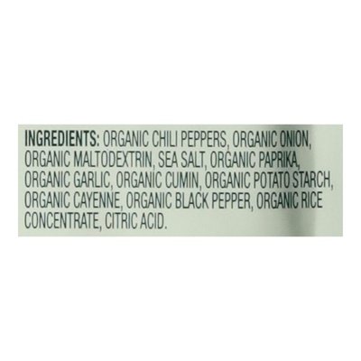 INGREDIENTS: Organic Chili Peppers, Organic Onion, Organic Maltodextrin, Sea Salt, Organic Paprika, Organic Garlic, Organic Cumin, Organic Potato Starch, Organic Cayenne, Organic Black Pepper, Organic Rice Concentrate, Citric Acid.