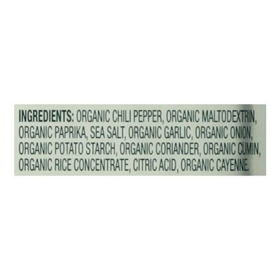 INGREDIENTS: Organic Chili Pepper, Organic Maltodextrin, Organic Paprika, Sea Salt, Organic Garlic, Organic Onion, Organic Potato Starch, Organic Coriander, Organic Cumin, Organic Rice Concentrate, Citric Acid, Organic Cayenne.