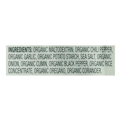 INGREDIENTS: Organic Maltodextrin, Organic Chili Pepper, Organic Garlic, Organic Potato Starch, Sea Salt, Organic Onion, Organic Cumin, Organic Black Pepper, Organic Rice Concentrate, Organic Oregano, Organic Coriander.