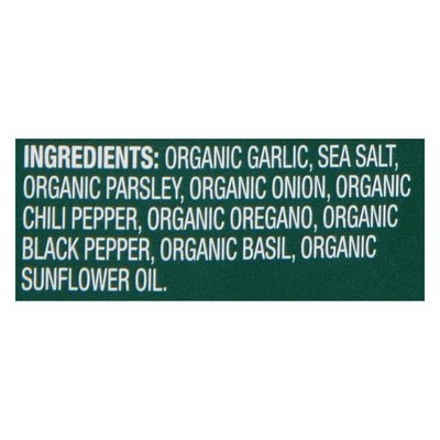 INGREDIENTS: Organic Garlic, Sea Salt, Organic Parsley, Organic Onion, Organic Chili Pepper, Organic Oregano, Organic Black Pepper, Organic Basil, Organic Sunflower Oil.