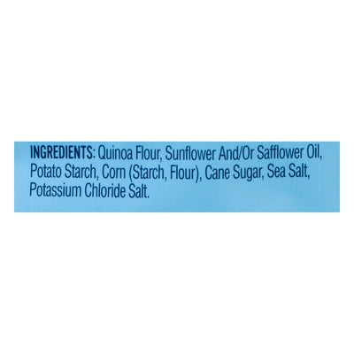 INGREDIENTS: Quinoa Flour, Potato Starch, Corn Starch, Sunflower and/or Safflower Oil, Corn Flour, Sugar, Sea Salt.