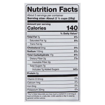 PRODUCT DETAILS: No artificial flavors and delicious! Per Serving (about 2-1/2 cups): 140 calories; 1 g sat fat (5% DV); 110 mg sodium (5% DV); 7 g sugars. 56 calories per cup. Certified gluten free. Certified vegan. Vegan.org. 50% Whole Grain: 12 g or more per serving. 50% or more of the grain is whole grain. WholeGrainsCouncil.org. See back panel for nutritional information. Non-GMO Project verified. nongmoproject.org. New & improved flavor! No artificial ingredients. Preservative free. Enjoy your favorite SkinnyPop popcorn with a sweet & salty crunch. We believe in snacking without compromise. To us, that means using the fewest leanest and simplest ingredients possible to bring you the best tasting popcorn. That's the Skinny! skinnypop.com. Facebook. Twitter. Instagram. Pinterest. Snack with Skinny Pop: Mini Cakes; Popcorn; Microwave. Made with 100% SkinnyPop Popcorn and always delicious! Popped Skinny in the USA.
