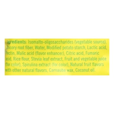 INGREDIENTS: Isomalto-Oligosaccharides (Vegetable Source), Chicory Root Fiber, Water, Modified Potato Starch, Lactic Acid, Pectin, Malic Acid (Flavor Enhancer), Citric Acid, Fumaric Acid, Rice Flour, Stevia Leaf Extract, Fruit and Vegetable Juice (for Color), Spirulina Extract (for Color), Natural Fruit Flavors with Other Natural Flavors, Carnauba Wax, Coconut Oil.