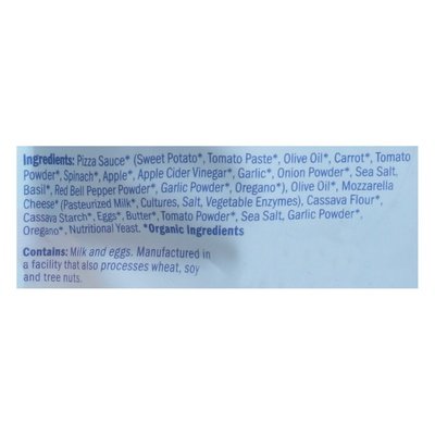 INGREDIENTS: Pizza Sauce (Organic Ingredients) (Sweet Potato (Organic Ingredients), Tomato Paste (Organic Ingredients), Olive Oil (Organic Ingredients), Carrot (Organic Ingredients), Tomato Powder (Organic Ingredients), Spinach (Organic Ingredients), Apple (Organic Ingredients), Apple Cider Vinegar (Organic Ingredients), Garlic (Organic Ingredients), Onion Powder (Organic Ingredients), Sea Salt, Basil (Organic Ingredients), Red Bell Pepper Powder (Organic Ingredients), Garlic Powder (Organic Ingredients), Oregano (Organic Ingredients)), Olive Oil (Organic Ingredients), Mozzarella Cheese (Organic Ingredients) (Pasteurized Milk (Organic Ingredients), Cultures, Salt, Vegetable Enzymes), Cassava Flour (Organic Ingredients), Cassava Starch (Organic Ingredients), Eggs (Organic Ingredients), Butter (Organic Ingredients), Tomato Powder (Organic Ingredients), Sea Salt, Garlic Powder (Organic Ingredients), Oregano (Organic Ingredients), Nutritional Yeast.