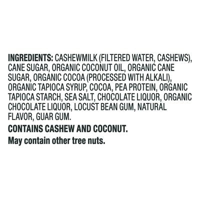 INGREDIENTS: Cashewmilk (Filtered Water, Cashews), Cane Sugar, Organic Coconut Oil, Organic Cane Sugar, Organic Cocoa (Processed with Alkali), Organic Tapioca Syrup, Cocoa, Pea Protein, Organic Tapioca Starch, Sea Salt, Chocolate Liquor, Organic Chocolate Liquor, Locust Bean Gum, Natural Flavor, Guar Gum.