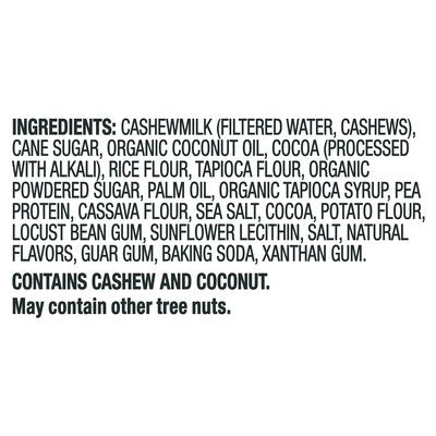 INGREDIENTS: Cashewmilk (Filtered Water, Cashews), Cane Sugar, Organic Coconut Oil, Cocoa (Processed with Alkali), Rice Flour, Tapioca Flour, Organic Powdered Sugar, Palm Oil, Organic Tapioca Syrup, Pea Protein, Cassava Flour, Sea Salt, Cocoa, Potato Flour, Locust Bean Gum, Sunflower Lecithin, Salt, Natural Flavors, Guar Gum, Baking Soda, Xanthan Gum.