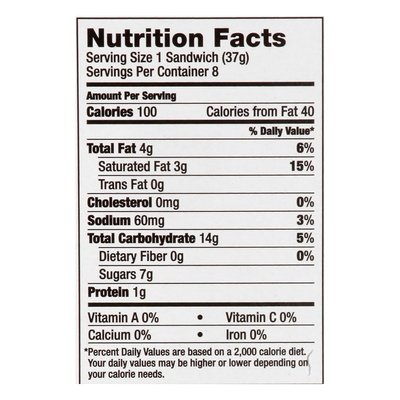 PRODUCT DETAILS: 100 calories per sandwich. Certified vegan. vegan.org. Non-GMO Project verified. nongmoproject.org. sodeliciousdairyfree.com. how2recycle.info. We would love to hear from you! Contact us: 1-866-388-7853. Discover more of our dairy-free delights! So Delicious Dairy-free Yogurt Alternative Coconutmilk Raspberry.