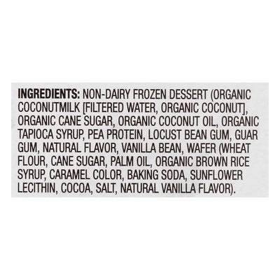 INGREDIENTS: Non-Dairy Frozen Dessert (Organic Coconutmilk [Filtered Water, Organic Coconut], Organic Cane Sugar, Organic Coconut Oil, Organic Tapioca Syrup, Pea Protein, Locust Bean Gum, Guar Gum, Natural Flavor, Vanilla Bean, Wafer (Wheat Flour, Cane Sugar, Palm Oil, Organic Brown Rice Syrup, Caramel Color, Baking Soda, Sunflower Lecithin, Cocoa, Salt, Natural Vanilla Flavor).