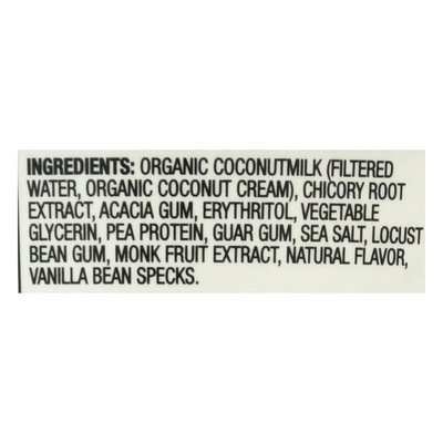 INGREDIENTS: Organic Coconutmilk (Filtered Water, Organic Coconut Cream), Chicory Root Extract, Acacia Gum, Erythritol, Vegetable Glycerin, Pea Protein, Guar Gum, Sea Salt, Locust Bean Gum, Monk Fruit Extract, Natural Flavor, Vanilla Bean Specks.
