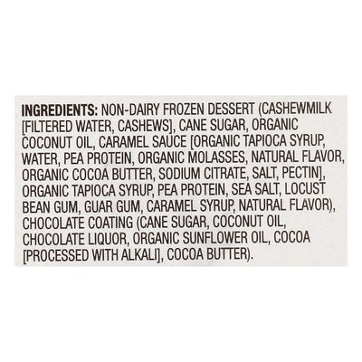 INGREDIENTS: Cashewmilk (Filtered Water, Cashews), Cane Sugar, Organic Coconut Oil, Organic Tapioca Syrup, Chocolate Liquor, Organic Sunflower Oil, Water, Cocoa (Processed with Alkali), Pea Protein, Sea Salt, Cocoa Butter, Locust Bean Gum, Natural Flavor, Organic Molasses, Guar Gum, Organic Cocoa Butter, Sodium Citrate, Caramel Syrup, Salt, Pectin.