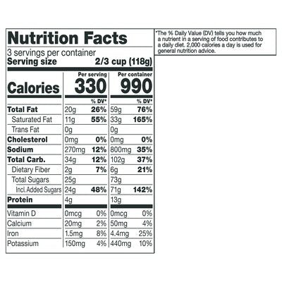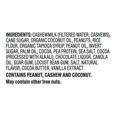 INGREDIENTS: Cashewmilk (Filtered Water, Cashews), Cane Sugar, Organic Coconut Oil, Peanuts, Rice Flour, Organic Tapioca Syrup, Peanut Oil, Invert Sugar, Palm Oil, Cocoa, Pea Protein, Sea Salt, Cocoa (Processed with Alkali), Chocolate Liquor, Canola Oil, Guar Gum, Locust Bean Gum, Salt, Natural Flavor, Cocoa Butter, Vanilla Extract.