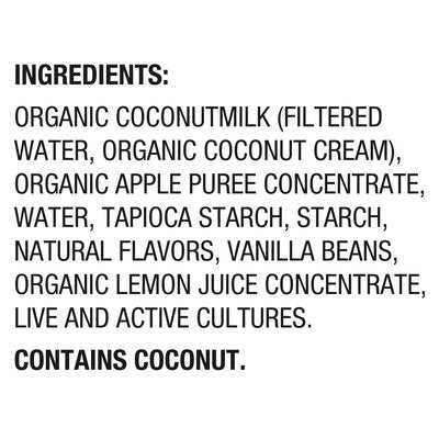 INGREDIENTS: Organic Coconutmilk (Filtered Water, Organic, Coconut Cream), Organic Apple Puree Concentrate, Water, Tapioca Starch, Natural Flavors, Vanilla Beans, Organic Lemon Juice Concentrate, Live and Active Cultures, Live and Active Cultures: S. Thermophilus, L. Bulgaricus, L. Casei, L. Acidophilus, and B. Lactis.