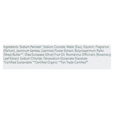 INGREDIENTS: Ingredients: Sodium Palmate (Certified Sustainable), Sodium Cocoate, Water (Eau), Glycerin, Fragrance (Parfum), Jasminum Sambac (Jasmine) Flower Extract, Butyrospermum Parkii (Shea) Butter (Certified Organic) (Fair Trade Certified), Olea Europaea (Olive) Fruit Oil, Rosmarinus Officinalis (Rosemary) Leaf Extract, Sodium Chloride, Tetrasodium Glutamate Diacetate.