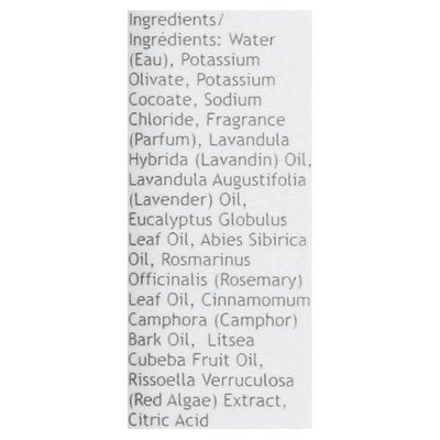 INGREDIENTS: Water (Eau), Potassium Olivate, Potassium Cocoate, Sodium Chloride Fragrance(Parfum), Lavandula Hybrida Oil, Lavandula Augustifolia (Lavender) Oil, Eucalyptus Globulus Leaf Oil, Rissoella Verruculosa Extract, Citric Acid, Xanthan Gum, Glycerin.