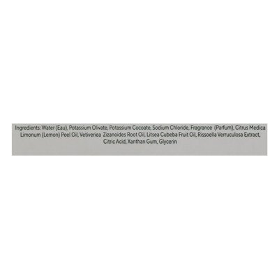 INGREDIENTS: Water (Eau), Potassium Olivate, Potassium Cocoate, Sodium Chloride, Fragrance (Parfum), Citrus Medica Limonum (Lemon) Peel Oil, Vetiveriea Zizanoides Root Oil, Litsea Cubeba Fruit Oil, Rissoella Verruculosa Extract, Citric Acid, Xanthan Gum, Glycerin.