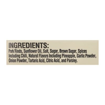 INGREDIENTS: Pork Rinds, Sunflower Oil, Salt, Sugar, Brown Sugar, Spices Including Chili, Natural Flavors Including Pineapple, Garlic Powder, Onion Powder, Tartaric Acid, Citric Acid, and Parsley