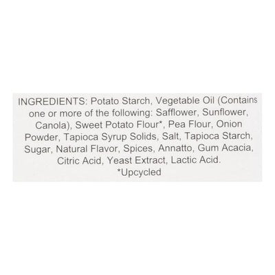 INGREDIENTS: Potato Starch, Vegetable Oil (Contains One or More of the Following: Safflower, Sunflower, Canola), Sweet Potato Flour (Upcycled), Pea Flour, Onion Powder, Tapioca Syrup Solids, Salt, Tapioca Starch, Sugar, Natural Flavor, Spices, Annatto, Gum Acacia, Citric Acid, Yeast Extract, Lactic Acid.