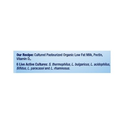 INGREDIENTS: Our Family Recipe: Cultured Pasteurized Organic Low Fat Milk, Pectin, Vitamin D3. 6 Live Active Cultures: S. Thermophilus, L. Bulgaricus, L. Acidophilus, Bifidus, L. Casei and L. Rhamnosus.