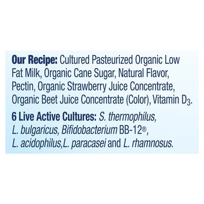 INGREDIENTS: Our Recipe: Cultured Pasteurized Organic Low Fat Milk, Organic Cane Sugar, Natural Flavor, Pectin, Organic Strawberry Juice Concentrate, Organic Beet Juice Concentrate (Color), Vitamin D3. 6 Live Active Cultures: S. Thermophilus, L. Bulgaricus, Bifidobacterium BB-12, L. Acidophilus, L. Paracasei and L. Rhamnosus.