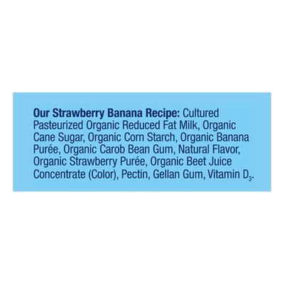 INGREDIENTS: Our Strawberry Banana Recipe: Cultured Pasteurized Organic Reduced Fat Milk, Organic Cane Sugar, Organic Corn Starch, Organic Banana Purée, Organic Carob Bean Gum, Natural Flavor, Organic Strawberry Purée, Organic Beet Juice Concentrate (Color), Pectin, Gellan Gum, Vitamin D3. 6 Live Active Cultures: S. Thermophilus, L. Bulgaricus, L. Acidophilus, Bifidus, L, Paracasei and L, Rhamnosus.